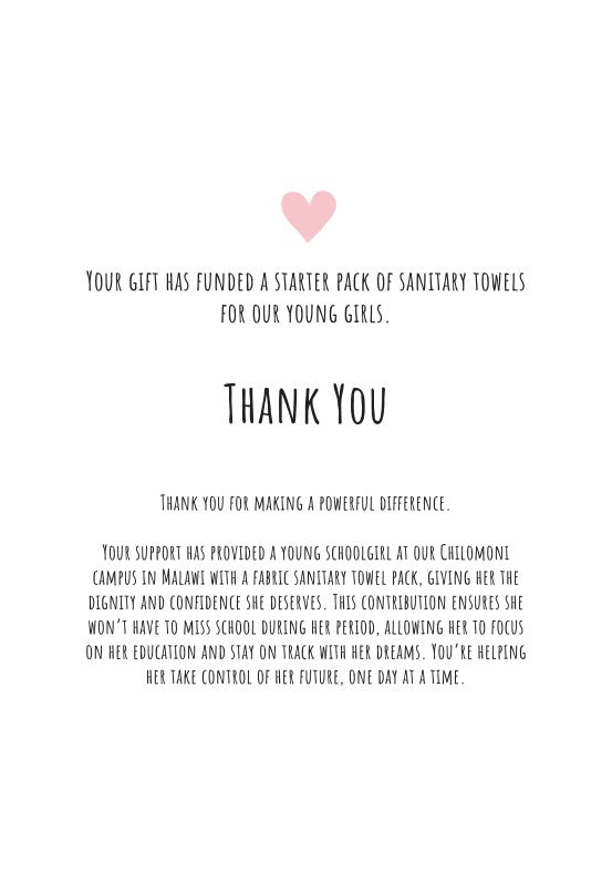Your purchase represents the donation of a reusable fabric sanitary towel pack to one of our students, we will send you a card that explains how this works.